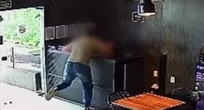 Imagens de câmeras de segurança mostram o momento em que o entregador entra no local, empurra um computador, arremessa um monitor e parte para cima do funcionário com socos. A vítima, Davidson, fugiu para se proteger.